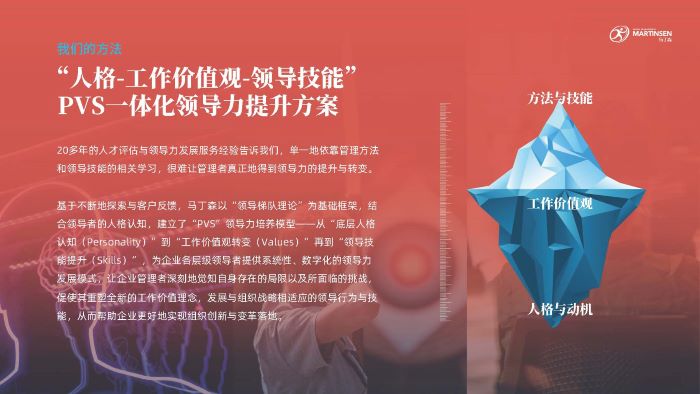 “以领导力驱动组织创新”的项目思路,是马丁森基于对本土领先企业的多年研究发现所得。其目的是针对快速发展的公司,或者正在进行变革的传统公司,将基于岗位的领导力要求、评价体系和领导力发展进行一体化打通,在管理中真正实现以领导力驱动组织创新的目的。这个一体化打通的理论基础,即马丁森的PVS组织领导力管理与发展模型。