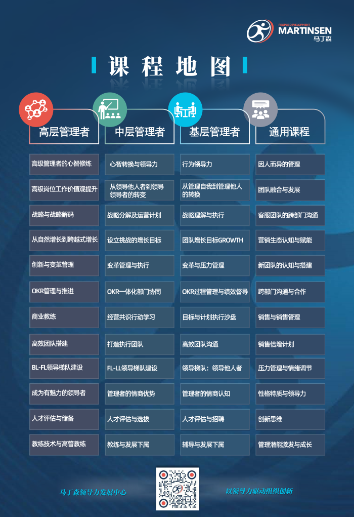 2023年是关键的一年,企业都在寻找各种“破圈”方法,提升领导力是其中一个充满挑战但正确的方法,谁先走在前面,谁就更快到达。马丁森始终致力于不断钻研和深耕于企业领导力发展领域,为我们的客户提供高效专业的解决方案,是我们一直在坚持的事。